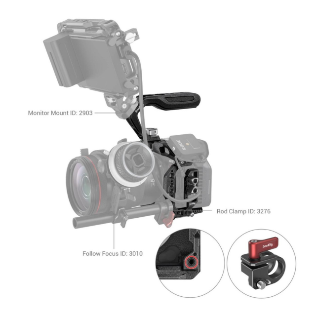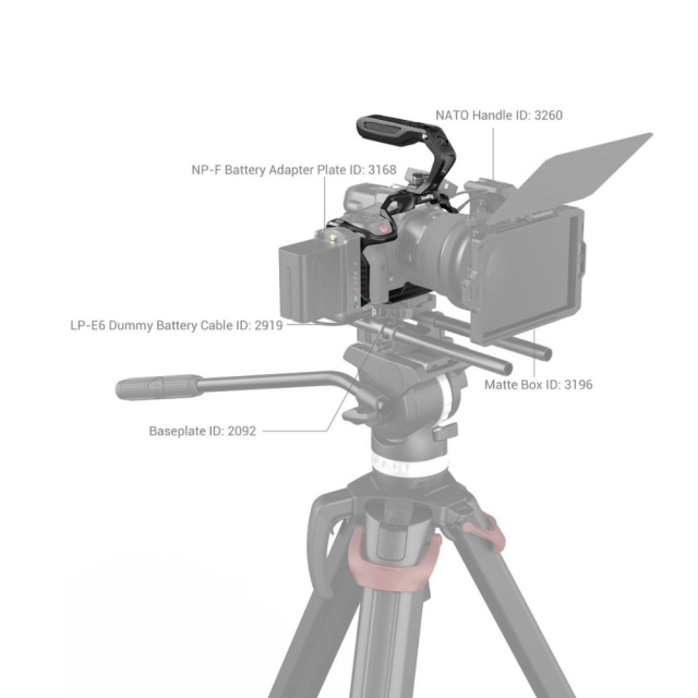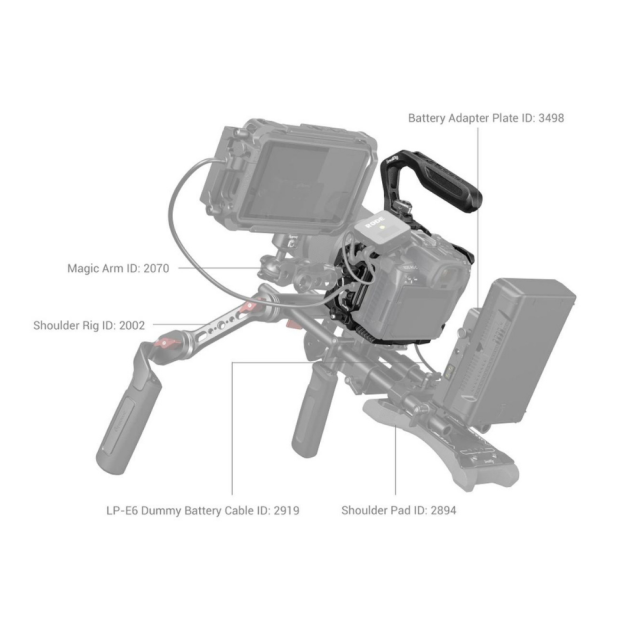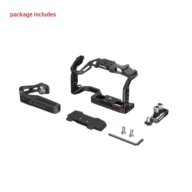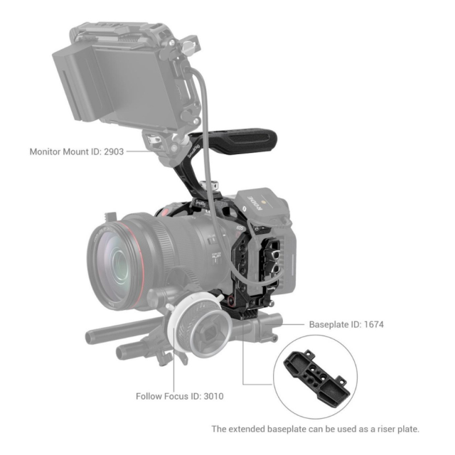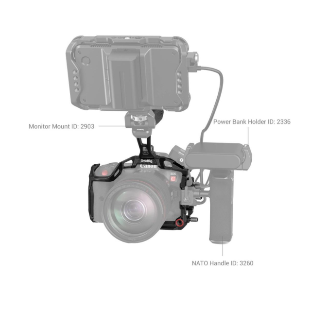 Ročni komplet SmallRig "Black Mamba" za Canon EOS R5 C 3891 je zasnovan za zaščito fotoaparata, udobno snemanje pod nizkimi koti in namestitev dodatne opreme. Vključuje zgornji ročaj ARRI, celotno kletko in posebno kabelsko objemko. Ergonomsko oblikovan zgornji ročaj je udoben in olajša snemanje pod nizkim kotom in premikanje fotoaparata; kletka v slogu "Black Mamba", ki je primerna za elemente EOS R5 C, omogoča popoln dostop do gumbov fotoaparata in je sestavljena iz sprednje kletke in odstranljive razširjene osnovne plošče, ki skupaj omogočata različne rešitve snemanja. Komplet vključuje luknje z navojem 1/4"-20, luknje z navojem 3/8"-16, hladno podstavek, stransko vodilo NATO 3260, magično roko 2070, nosilec za monitor 2903, ploščo za adapter za baterijo 3168, nosilec za prenosno napajalno banko 2336, mikrofon, luč LED itd; in osnovno ploščo Arca-Swiss, ki podpira DJI RS 2/RSC 2 in stativ Arca-Swiss, kar omogoča hitro preklapljanje med snemanjem z roke, stabilizatorjem in stativom. Njegova vijačna objemka za kable HDMI in USB-C lahko prepreči nenamerno prekinitev povezave in zagotovi stabilen prenos signala. Kletka vključuje tudi obojestranski imbusni ključ za enostavno montažo in demontažo.