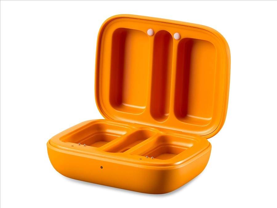 je zaščitni kovček za prenosnike in sprejemnik. Deluje tudi kotpolnilna postaja, ki zagotavlja, da se oddajniki napolnijo med prevozom ali odmori med snemanjem. Napaja se lahko s priloženim kablom USB-C ali znotranjo baterijo, ki lahkodvakrat popolnoma napolnivse komponente kompleta.