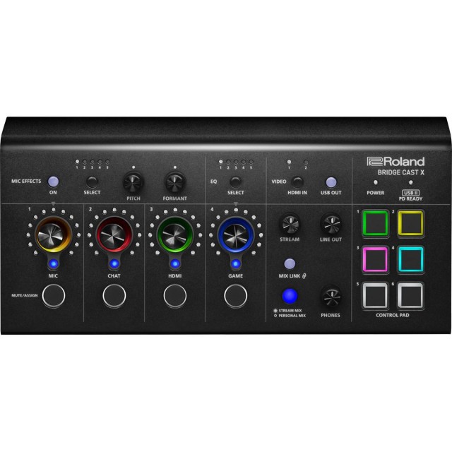 Izboljšajte svoje prenose s programom Bridge Cast X, kompaktno namizno rešitvijo "vse v enem" s priročnimi upravljalnimi elementi in Rolandovimi profesionalnimi funkcijami A/V. Poslovite se od nepregledne množice drobnih dodatkov in poenotite svoj delovni proces z več priključki za igralne konzole, računalnike, fotoaparate in zvočne naprave. Premagajte konkurenco z odličnimi funkcijami, kot so dvojno mešanje zvoka, podpora za profesionalne mikrofone (XLR, fantomski), obdelava vokalov na podlagi učinkov, ergonomsko upravljanje z blazinicami in še več..