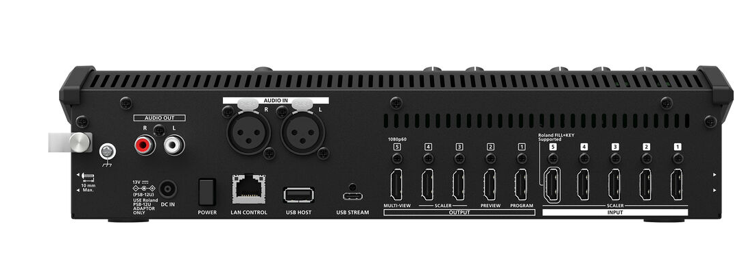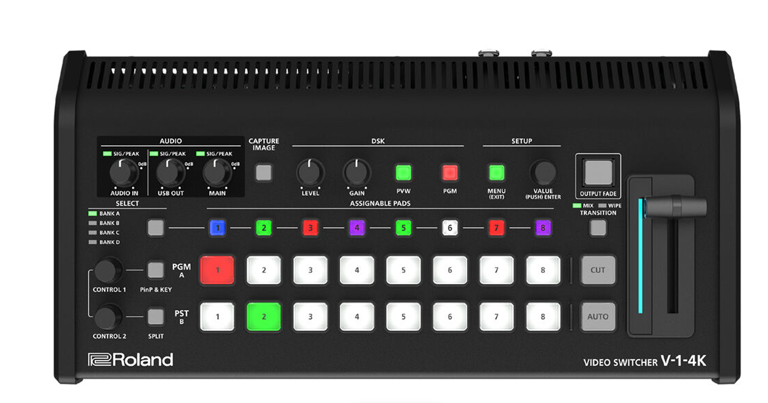 Videomikser Roland V-1-4K omogoča profesionalno produkcijo videov v prenosni in uporabniku prijazni obliki. Opremljen je s 5 HDMI-vhodi s skalerji, 5 HDMI-izhodi in izhodom USB-C za pretakanje, kar omogoča nemoteno povezovanje več kamer, prenosnih računalnikov ali drugih HDMI-virov. Preklopnik podpira UHD 4K60 HDR, kot tudi zmanjšanje ločljivosti na 1080p, vključuje pa tudi izrezovanje območja interesa (ROI), chroma key in luma key učinke za ustvarjalno produkcijo v živo. Zvok se upravlja prek 2 XLR vhodov in izhodov prek RCA in 3,5-mm vrat, s 14-kanalnim mešalnikom za profesionalno upravljanje. Brezplačna spremljevalna programska oprema – V-1-4K RCS, V-1-4K Remote in Graphics Presenter – ponuja intuitivno upravljanje učinkov, naslovov in gibljivih grafik. Lahka in kompaktna, je idealna za dogodke v živo, poslovne predstavitve, učilnice ali verske objekte.