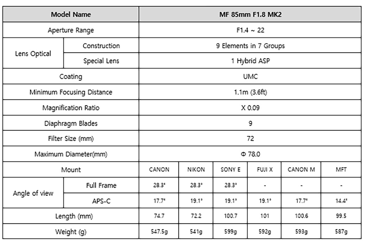 Samyang MF 85 mm F1,4 MK2 je nova generacija priljubljenega ročnega portretnega objektiva z odličnim prikazom barv in slike zunaj globinske ostrine. Na voljo v različicah Canon EF, Nikon F, Sony E, Fujifilm X, Canon M in MFT. Nova različica MK2 ima enako optično zasnovo kot prvotni model, vendar je zdaj odporna proti vremenskim vplivom, ima nov obroč za ostrenje za boljši oprijem in stikalo, ki omogoča neskončno nastavitev zaslonke.