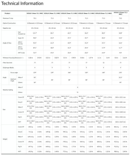 Komplet VDSLR MK2 vključuje šest modelov s pogosto uporabljenimi goriščnicami 14 mm T3,1, 24 mm T1,5, 35 mm T1,5, 50 mm T1,5, 85 mm T1,5 in 135 mm T2,2 za šest tipov bajoneta: Canon EF, Sony E, Nikon F, Canon M, Fuji X in MFT. Vsi objektivi v tej liniji imajo visokokakovostno optično konstrukcijo z uporabo leč ASP ali ED za zmanjšanje aberacije in ostre, jasne slike. Zaradi nove zaslonke, sestavljene iz devetih lopatic, ustvarjajo tudi visokokakovostne slike zunaj globinske ostrine.