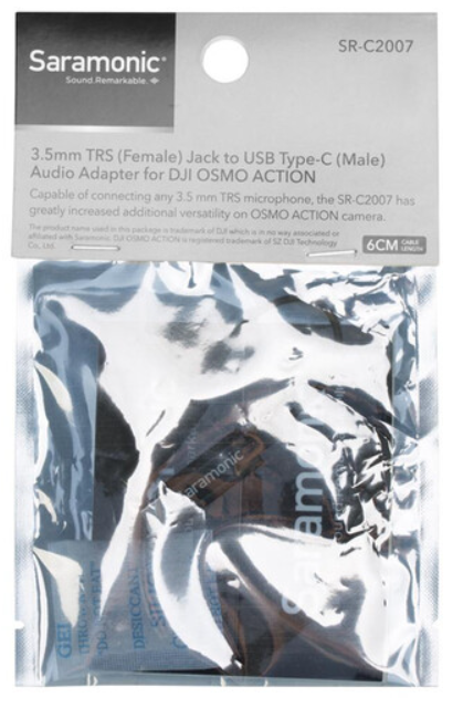 Saramonic SR-C2007 je kompakten 2,4-palčni (6 cm) avdio adapter kabel, optimiziran za kamere DJI Osmo Action, z pozlačenim 3,5-mm TRS ženskim konektorjem na enem koncu in USB Type-C moškim konektorjem na drugem koncu, ki omogoča neposredno zajemanje zvoka iz zunanjih mikrofonov, brezžičnih sprejemnikov, snemalnikov ali mešalnikov. Zagotavlja napajanje za mikrofone, ki ne delujejo na baterije, ima korozijsko odporne pozlačene kontakte za neoporečno kakovost signala in tehta le 6 g, kar ustvarjalcem, usmerjenim v akcijo, ponuja trajno, nizkoprofilno rešitev za izboljšanje video zvoka v ekstremnih pogojih.