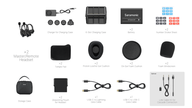 WiTalk9 SE 2S je najsodobnejši brezžični interkomski sistem, prilagojen profesionalnim ekipam, ki potrebujejo nemoteno komunikacijo brez uporabe rok v dinamičnih okoljih, kot so snemanje filmov, prireditve v živo, oddajanje in produkcija na odru. Ta sistem za 5 oseb uporablja tehnologijo ClearTalk™ podjetja Saramonic, ki združuje tri mikrofone in sofisticirane algoritme za odpravljanje šuma, da zagotovi kristalno čisto 360° zajemanje zvoka in zavračanje okoljskega šuma.