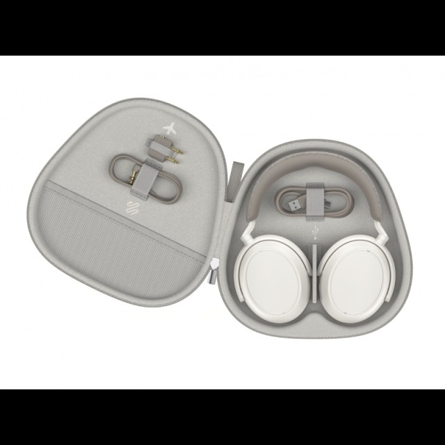Zvok in nastavitve upravljate prek intuitivnih dotiknih površin in mobilne aplikacije, kjer lahko prilagodite izenačevalnik in ANC ali shranite profile za različne okolje. Paket vključuje elegantno torbico, USB-C kabel za polnjenje, 3,5-mm avdio kabel in adapter za letalo.