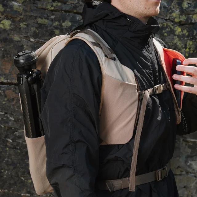 Ramenski trakovi, navdihnjeni z jopico, z elastičnimi žepi na zadrgo in vgrajenim MagSafe polnilnim kanalom za hiter dostop do fotoaparata, filma, telefona, filtrov in prigrizkov, ki jih imate pri sebi.