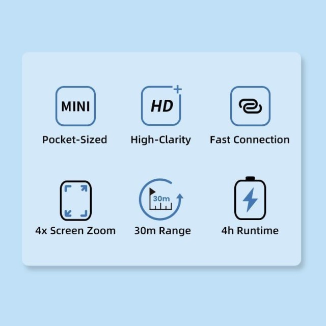 Baterija s kapaciteto 1200 mAh zagotavlja do 4 ure neprekinjenega delovanja, nadzor zaklopa prek Bluetooth pa omogoča daljinsko upravljanje iPhona z razdalje do 30 metrov. Magnetno pritrditev omogoča prilagodljivo pritrditev na stative, nosilce ali ustvarjalne postavitve. Zamik 60 ms zagotavlja odzivno spremljanje videa.