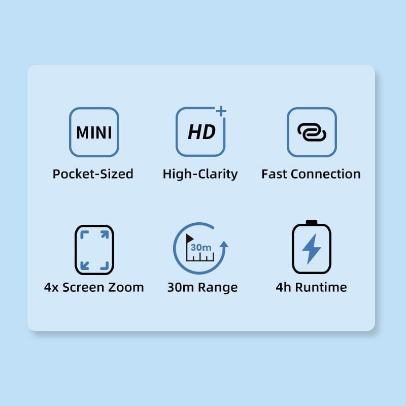 Shimbol CP5 Mini2 Black se takoj poveže z iPhoni prek brezžičnega omrežja 2,4G/5G, kar ustvarjalcem omogoča spremljanje in nadzor snemanja na poti. 2,4-palčni HD-zaslon (ločljivost 480 × 800) zagotavlja ostre slike, pametni zoom pa poveča okvirje brez črnih pasov. S težo le 60 g je idealen za minimalistične postavitve, potovanja, vloganje in selfije brez uporabe rok.
