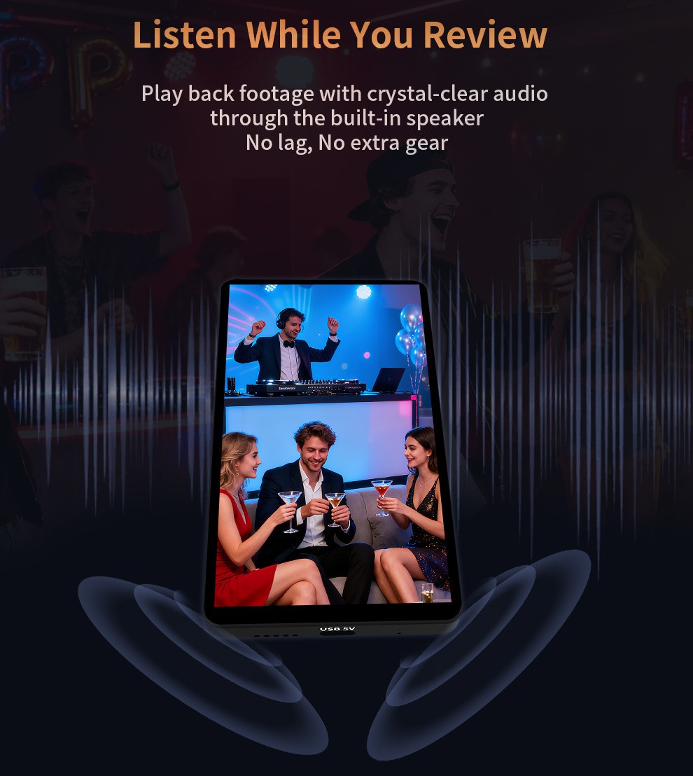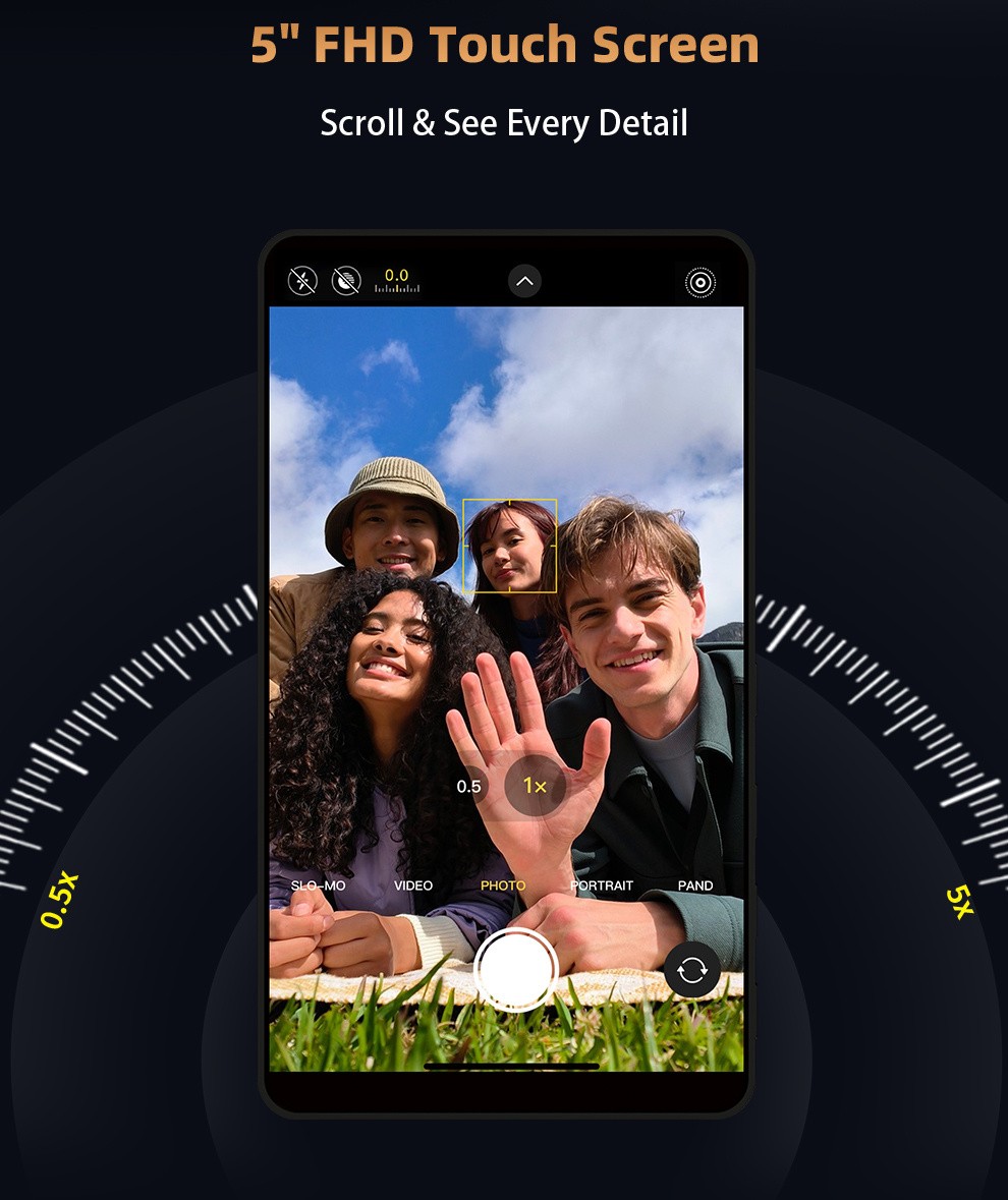 Njegov 5-palčni Full HD (1080 × 1920) večdotični LCD zaslon zagotavlja kristalno jasen predogled in podpira intuitivne geste, kot so približevanje s ščipkanjem, ostrenje s tapom in navigacija s potegom za natančen nadzor kamere. Z zrcaljenjem zaslona in zrcalnim obračanjem lahko pred zajemom pravilno predogledate posnetke, kar je idealno za selfije, portrete, panoramske poglede in produkcijo videov.