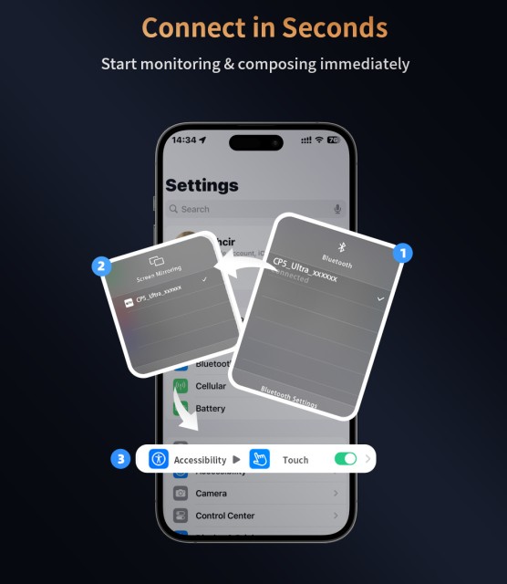 CP5 Ultra Black je zasnovan za ustvarjalce, ki želijo popoln nadzor pri uporabi zadnje kamere svojega pametnega telefona. Opremljen je s tehnologijo povratnega nadzora, ki omogoča brezžično upravljanje katere koli aplikacije – kamere, družbenih omrežij ali ustvarjalnih orodij – neposredno z monitorja, tako da med snemanjem ali fotografiranjem ni treba dotikati telefona.