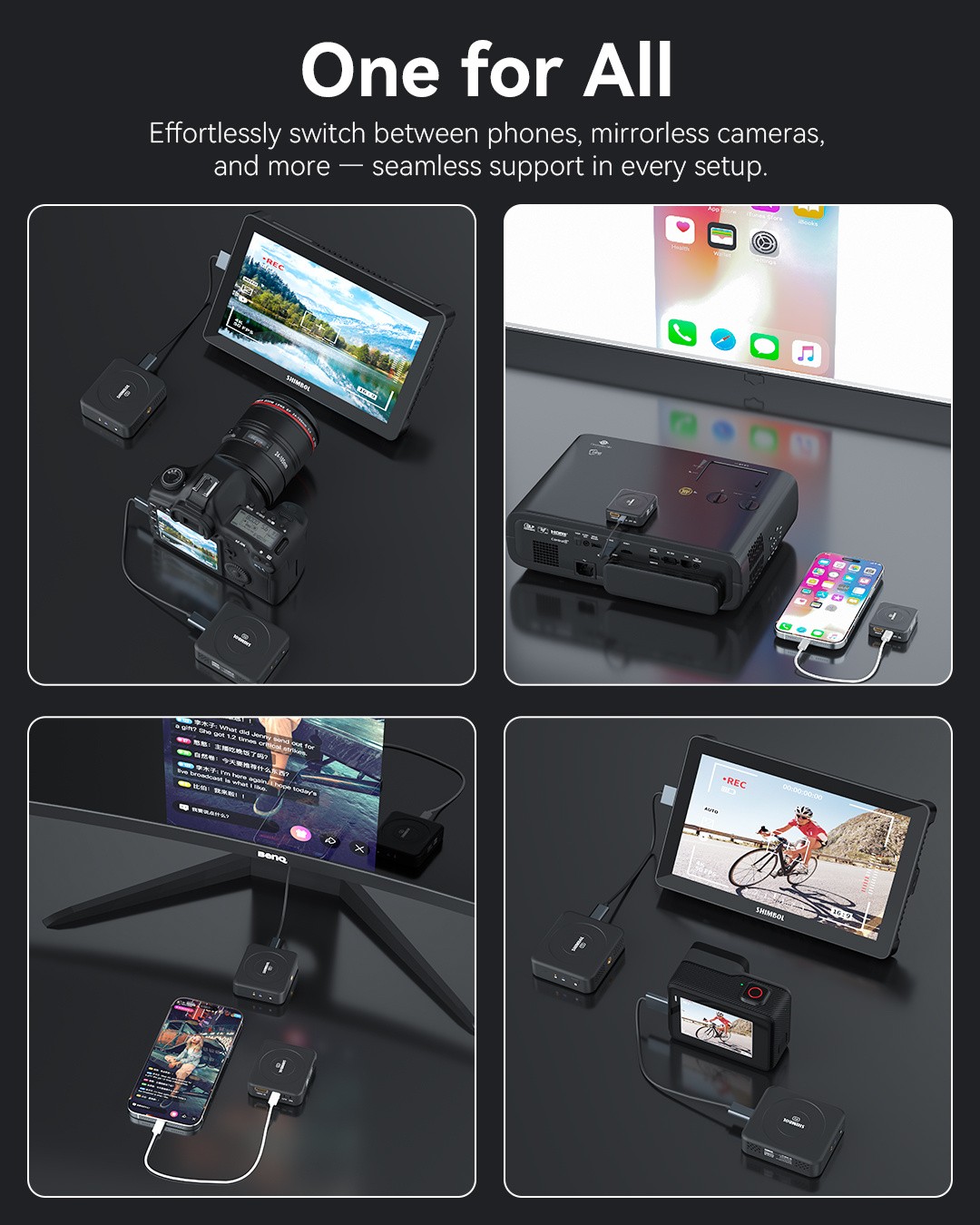 Shimbol TP Nano – prvi brezžični video oddajnik na svetu, ki deluje na baterije: Ultrakompaktna vgrajena baterija s kapaciteto 2000 mAh za več kot 4 ure brezžičnega delovanja, domet 150 m z izjemno nizko zakasnitvijo 60 ms, prenos FHD 1080p60, MagSafe-ready snap-on za telefone, HDMI/USB-C vhodi, samodejno preklapljanje…