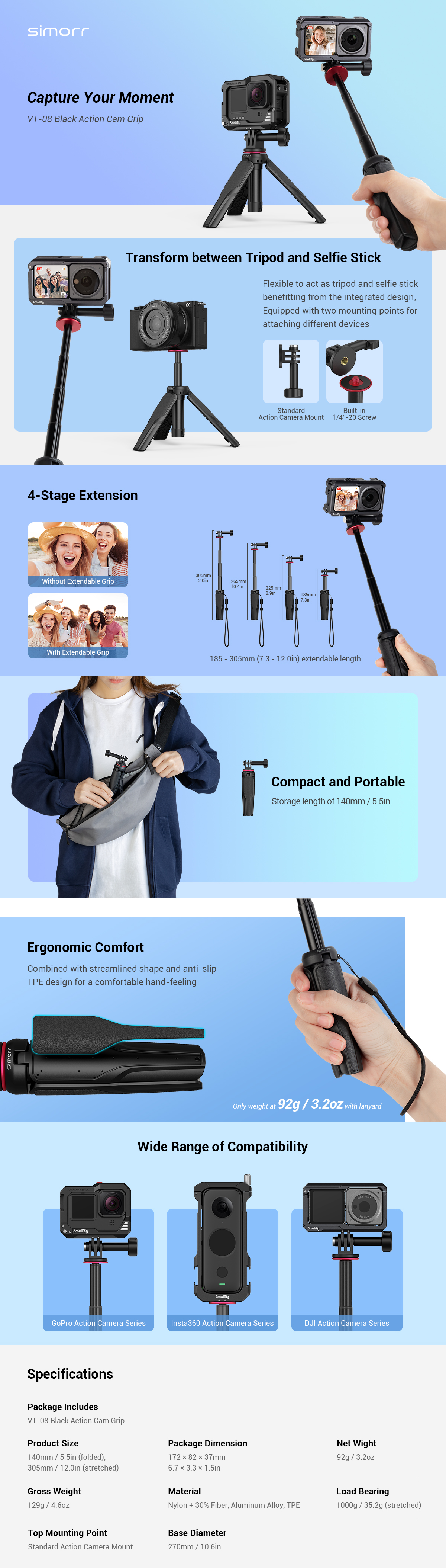simorr VT-08 Action Cam Grip 3791 Izdelki so izdelani iz najlona + vlaken, aluminijeve zlitine in drugih materialov, so kompaktni in prenosni, hkrati pa bolj stabilni in nosilni. Vgrajena zasnova stativa in palice za selfije podpira prosto preklapljanje po potrebi, na vrhu pa so za povezavo in podaljšanje uporabljeni priključki za akcijske kamere, ki so združljivi z akcijskimi kamerami različnih znamk, kot so insta360, Gopro in DJI. Izdelek ima velikost shranjevanja 14 cm, največjo natezno dimenzijo 30,5 cm in tehta le 92 g.