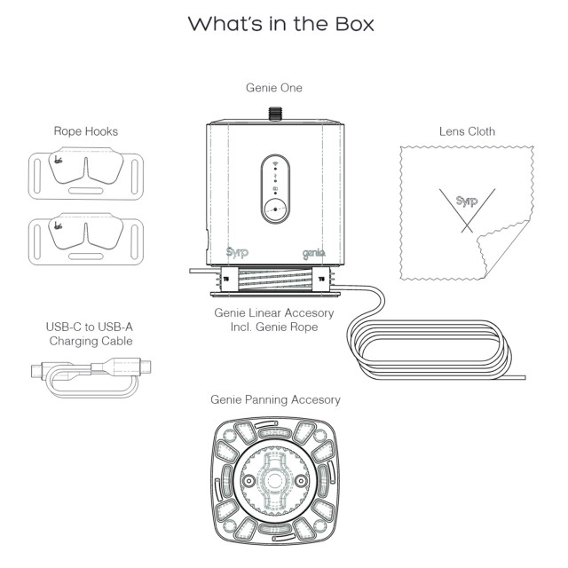 Genie One lahko upravljate na daljavo z aplikacijo za iOS/Android ter Bluetooth 4.2 in Wi-Fi. Aplikacija omogoča tudi ustvarjanje ključnih kadrov, posodabljanje vdelane programske opreme ali priklic prednastavitev ("Stars" itd.) za čim bolj preprosto uporabo. Čeprav gre za osnovni model v proizvajalčevi ponudbi, ga je mogoče kombinirati, na primer, z Genie Mini II za nadzor gibanja v največ treh oseh. Seveda ima trpežno ohišje iz aluminijeve zlitine in vgrajeno baterijo z dolgo življenjsko dobo (do 5 h za snemanje videoposnetkov, največ 48 h za fotografiranje s časovnim zamikom; polnjenje prek USB-C, 5V/3A približno 2,5 h). Največja obremenitev je 15 kg (pri navpični namestitvi).