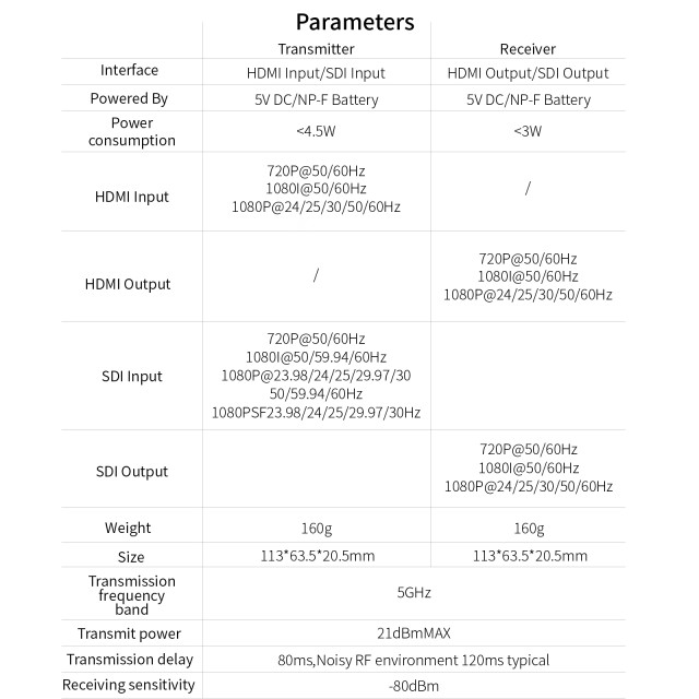 Komplet oddajnikov se uporablja za brezžični prenos videoposnetkov do 1080p60 v frekvenčnem pasu 5 GHz na razdalji približno 182 m (neposredna vidljivost) z zakasnitvijo približno 80 ms. Sistem ponuja vhode/izhode HDMI in HD-SDI (oddajnik ima vhode 1x HDMI tipa A in 1x HD-SDI, sprejemnik pa izhode 1x HDMI tipa A in 1x HD-SDI), napajanje prek vrat USB-C (ali prek baterije Sony L-Series; ni vključena) ter možnost sprejemanja signala ne le s sprejemnikom, temveč tudi s telefoni in tablicami. Obe enoti imata pasivno hlajenje za tiho delovanje, notranje antene in odlično berljive zaslone stanja OLED.