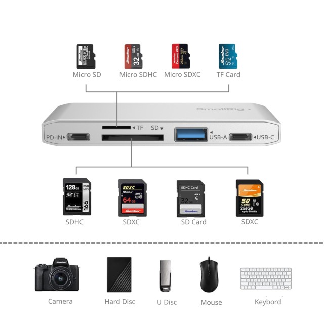 Čitalnik pomnilniških kartic SmallRig 5 v 1 za potovalno fotografijo 4746 je zasnovan za enostavno upravljanje in varnostno kopiranje fotografij, videoposnetkov in datotek v mobilnih napravah med potovanjem. Z vmesnikom PD 65 W omogoča hitro prehodno polnjenje in zagotavlja stabilen prenos podatkov. Priloženi 120-centimetrski kabel podpira prenos podatkov s hitrostjo 5 Gb/s, kar omogoča hkraten prenos podatkov in polnjenje brez prekinitve uporabe telefona.