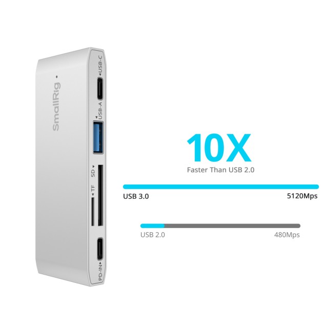 Z dvema priključkoma USB-C in USB-A s hitrostjo 5 Gb/s omogoča hiter prenos datotek s kapaciteto 1 GB v samo dveh sekundah. Dvojne reže za kartice SD/TF podpirajo hkratno branje in pisanje z največjo hitrostjo branja 100 MB/s, pri čemer so primerne za kartice SD, SDHC, SDXC, Micro SD, Micro SDXC in Micro SDHC. Poleg tega je univerzalno združljiv z operacijskimi sistemi Android, iOS, Windows in macOS.