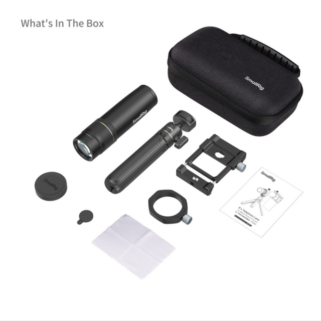 Namestitev je preprosta s standardnim T-mountom, zato je združljiv z različnimi mobilnimi napravami. Da boste imeli na voljo vse, kar potrebujete, so v paketu še objemka za objektiv, stativ, adapter, pokrovček objektiva, krpa za čiščenje in navodila za uporabo, vse skupaj pa je priročno shranjeno v vrečki za shranjevanje, ki omogoča enostaven dostop in organizacijo.