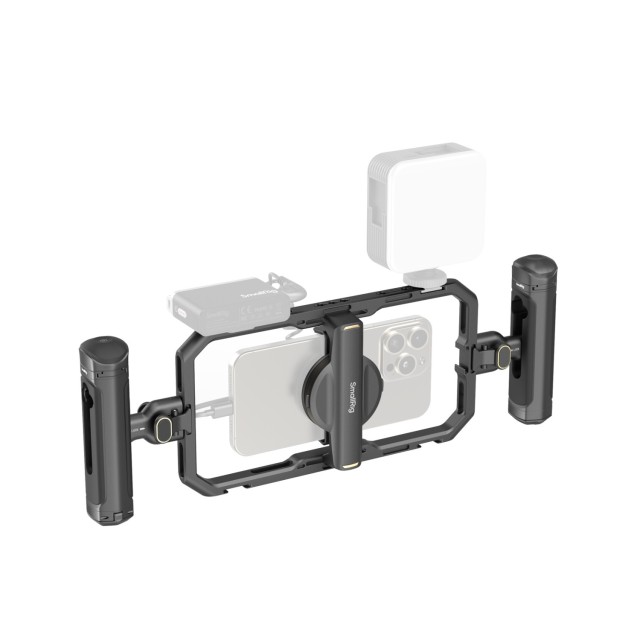 SmallRig All-in-One Video Kit For Smartphone Creators Quick Basic Edition 4597 zagotavlja učinkovito in kompaktno rešitev za profesionalno snemanje videoposnetkov s pametnimi telefoni. Komplet vključuje univerzalno kletko za pametni telefon, ročaj za hitro sproščanje z brezžičnim upravljanjem in stranski ročaj za hitro sproščanje. Nadgrajena univerzalna kletka ima več lukenj z navojem 1/4"-20 in nastavke za hladno čevelj, kar omogoča razširitev širokega nabora profesionalne video opreme. Poleg tega omogoča pritrditev 67-milimetrskih magnetnih filtrov ter ima odprtino za ramenski pas in režo za pritrditev na dock. Kletka lahko varno zaklene telefon z magnetnim nastavkom MagSafe ali sponko za telefon. Stranski ročaj s hitrim sproščanjem podpira hitro pritrditev in lahko z različnimi načini montaže deluje kot stranski in zgornji ročaj. Snemljiv brezžični krmilnik omogoča daljinski sprožitev zaklopa in snemanje, pri čemer je največja razdalja daljinskega upravljanja do 10 m / 32,8 čevljev.