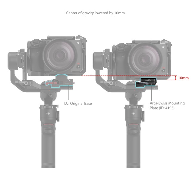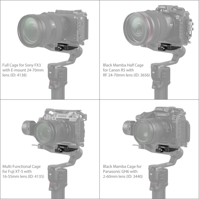 Plošča SmallRig Arca-Swiss Mount Plate za DJI RS 3 Mini 4195 je zasnovana tako, da podpira številne druge fotoaparate, kot so Sony FX3 z objektivom 24-70 mm, Canon R5 z objektivom 24-70 mm, FUJIFILM X-T5 z objektivom 16-55 mm in LUMIX GH6 z objektivom 12-60 mm. Komplet pomaga tudi pri hitrem preklopu med navpičnim in vodoravnim fotografiranjem.