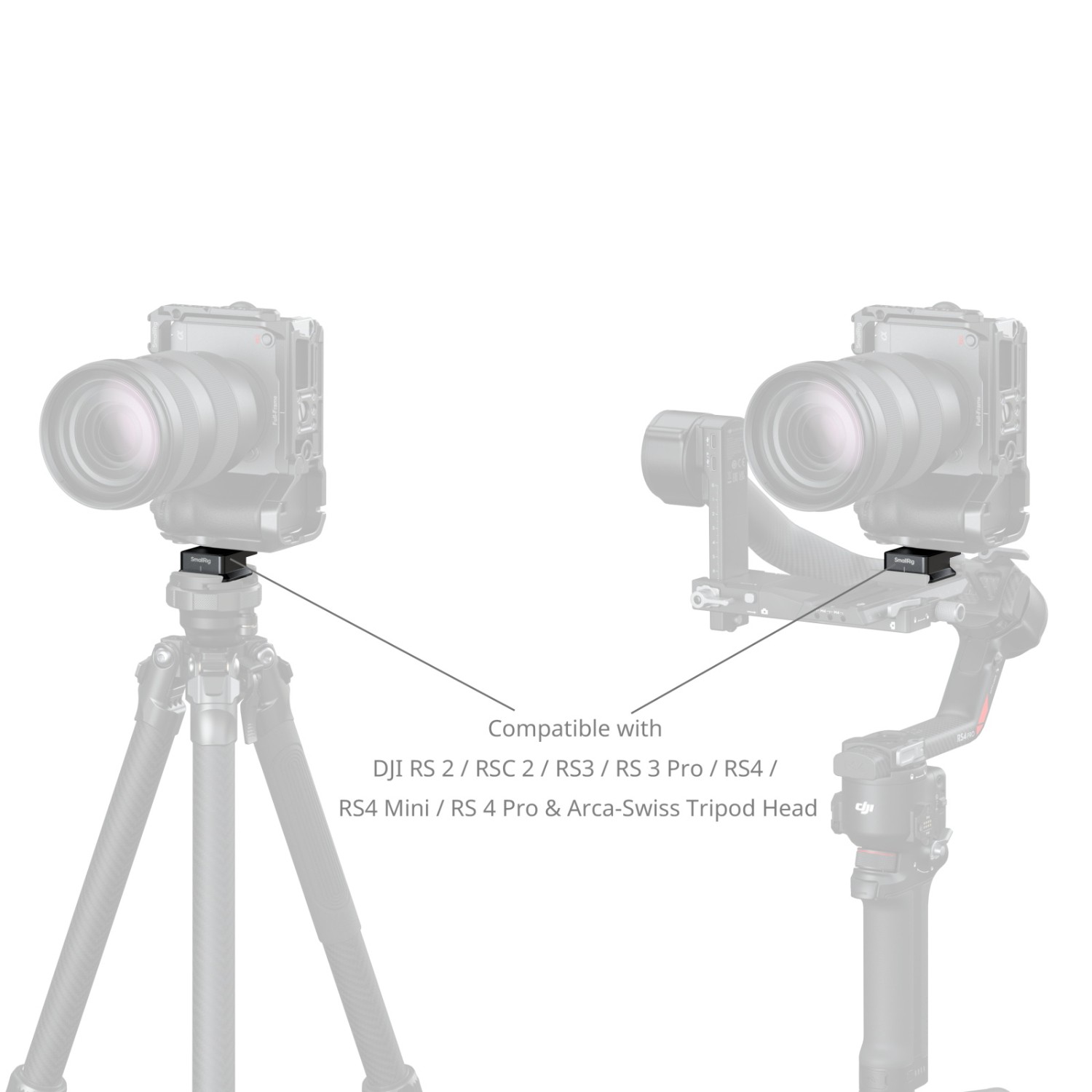 Plošča je združljiva s stojali tipa Arca in stabilizatorji serije DJI RS (vključno z RS 2, RSC 2, RS 3, RS 3 Pro, RS 4, RS 4 Pro in RS 4 Mini), kar omogoča učinkovite prehode med stojalom in gimbalom za izboljšanje delovnega toka. Za enostavno namestitev in odstranitev je priložen ključ z dvojno glavo.