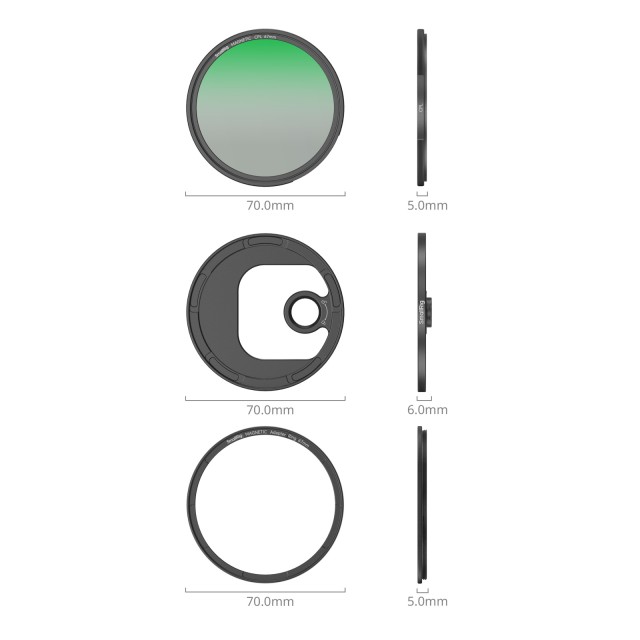Filter SmallRig z možnostjo pritrditve CPL z adapterjem za namestitev filtra T-mount (67 mm) 4728 Z uporabo polarizacijskega filtra in njegovo nastavitvijo pod ustreznim kotom lahko učinkovito zmanjšamo odseve na vodi, steklu in mirujočih predmetih. Večplastno optično steklo zagotavlja zanesljivo optično kakovost. Magnetni sistem pritrditve uporabnikom omogoča hitro in učinkovito namestitev in zamenjavo filtrov. Komplet vključuje adapterski obroček T-mount za neposredno vgradnjo z zadnjo ploščo T-mount na kletkah serije iPhone. Filter, opremljen z adapterskim obročem z navojem, je mogoče namestiti na 67-milimetrski objektiv fotoaparata, kar zagotavlja priročno izkušnjo magnetne namestitve filtra za objektive fotoaparata.