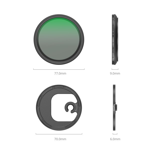 SmallRig Priložljiv komplet filtrov VND ND2-ND32 (1-5 stopenj) z adapterjem za filtre M-mount 67 mm 4724 S filtrom VND z nastavljivim zmanjšanjem osvetlitve ga lahko uporabniki prilagodljivo uporabljajo pri snemanju videoposnetkov, kar jim zagotavlja razumne nastavitve parametrov osvetlitve in zagotavlja bolj profesionalne videoposnetke. Večplastno optično steklo zagotavlja zanesljivo optično kakovost in zagotavlja, da zajete slike niso vinjetirane. Magnetni sistem pritrditve uporabnikom omogoča hitro in učinkovito namestitev in zamenjavo filtrov. Komplet vključuje adapterski obroček M-mount za neposredno vgradnjo z zadnjo ploščo M-mount na kletkah serije iPhone. Filter, opremljen z adapterskim obročem z navojem, je mogoče namestiti na 67-milimetrski objektiv fotoaparata, kar zagotavlja priročno izkušnjo magnetne namestitve filtra za objektive fotoaparata.