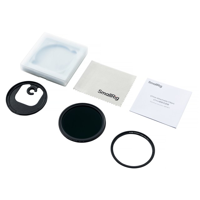 SmallRig Priložljiv komplet filtrov VND ND2-ND32 (1-5 stopenj) z adapterjem za filtre M-mount 67 mm 4724 S filtrom VND z nastavljivim zmanjšanjem osvetlitve ga lahko uporabniki prilagodljivo uporabljajo pri snemanju videoposnetkov, kar jim zagotavlja razumne nastavitve parametrov osvetlitve in zagotavlja bolj profesionalne videoposnetke. Večplastno optično steklo zagotavlja zanesljivo optično kakovost in zagotavlja, da zajete slike niso vinjetirane. Magnetni sistem pritrditve uporabnikom omogoča hitro in učinkovito nameščanje in zamenjavo filtrov. Komplet vključuje adapterski obroček M-mount za neposredno vgradnjo z zadnjo ploščo M-mount na kletkah serije iPhone. Filter, opremljen z adapterskim obročem z navojem, je mogoče namestiti na 67-milimetrski objektiv fotoaparata, kar zagotavlja priročno izkušnjo magnetne namestitve filtra za objektive fotoaparata.