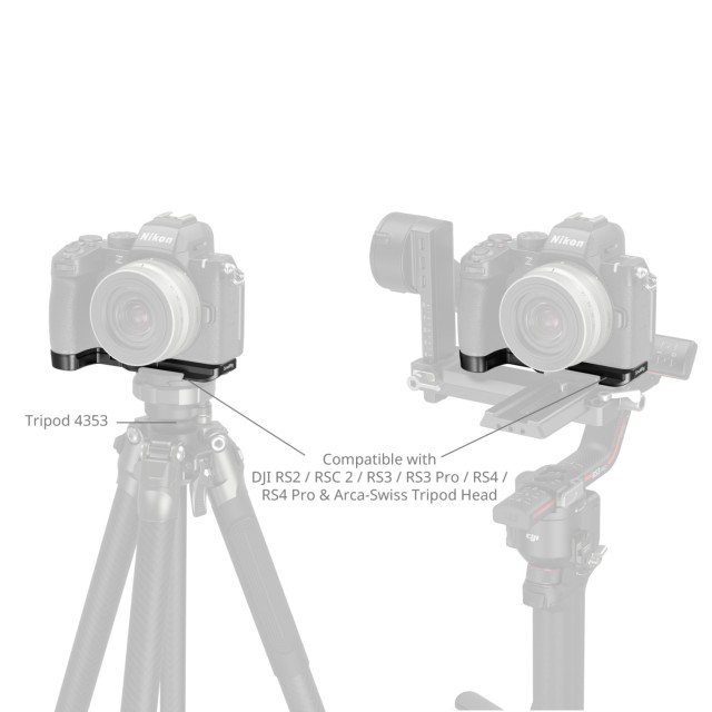 Ta plošča ima na dnu vgrajeno luknjo z navojem 1/4"-20, zato je vsestransko uporabna za razširitev, na primer za pritrditev ročaja za fotografiranje (ID 4551). Poleg tega vgrajena plošča za hitro sproščanje Arca-Swiss omogoča preklapljanje med stativi tipa Arca in stabilizatorji DJI RS2 / RSC 2 / RS3 / RS3 Pro / RS4 / RS4 Pro, kar olajša prehode med nastavitvami snemanja iz roke, stabilizatorja in stativa.