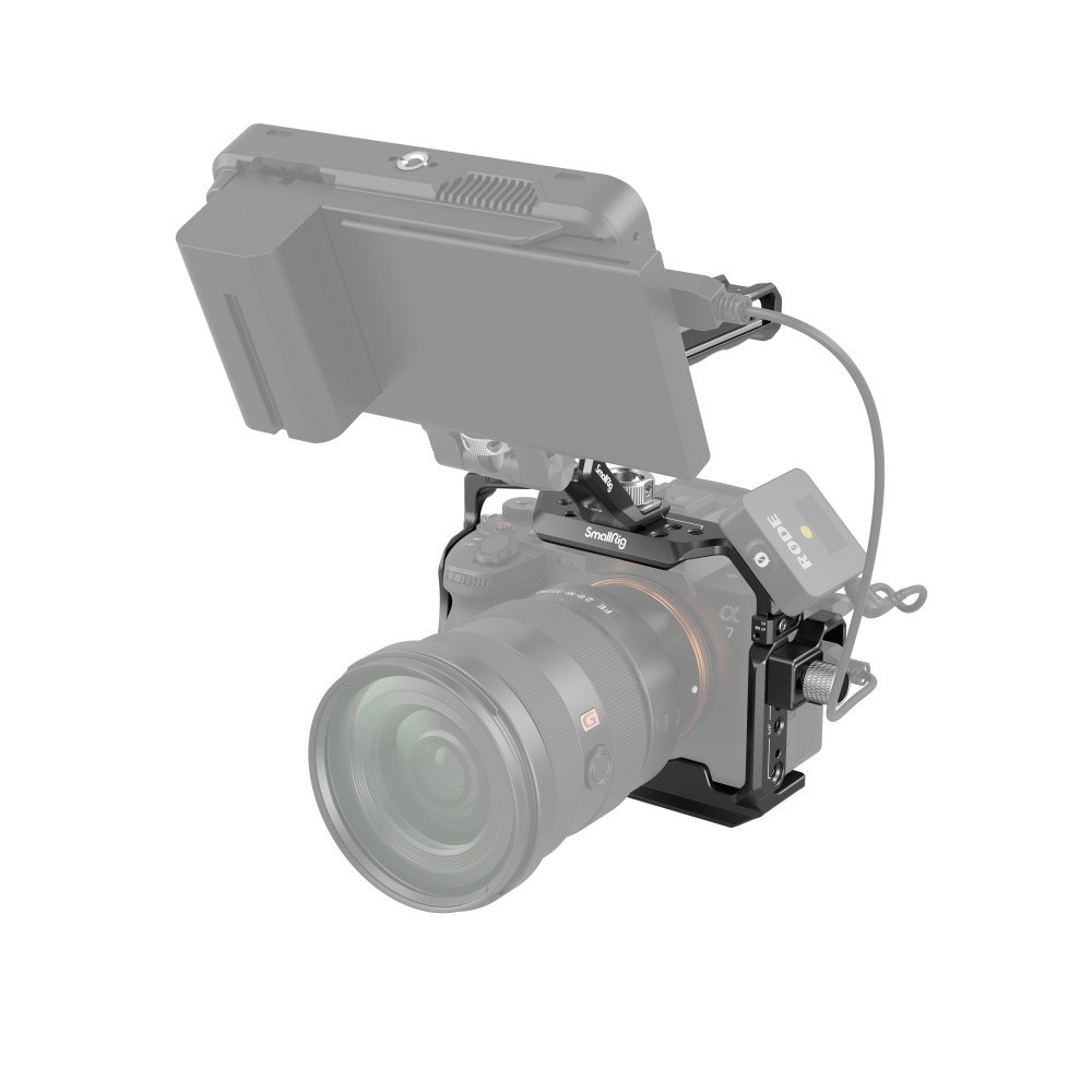 SmallRig Cage Kit za Sony Alpha 7R V / 7 IV / 7S III / 7 V 3668B je zasnovan za lažje snemanje iz nizkega kota in zaščito kamere, hkrati pa ponuja široko paleto dodatkov za pritrditev. Vključuje okvir, sponko za HDMI kabel in zgornji ročaj. Zgornji ročaj je udoben in omogoča enostavno nošenje pri snemanju iz nizkega kota.