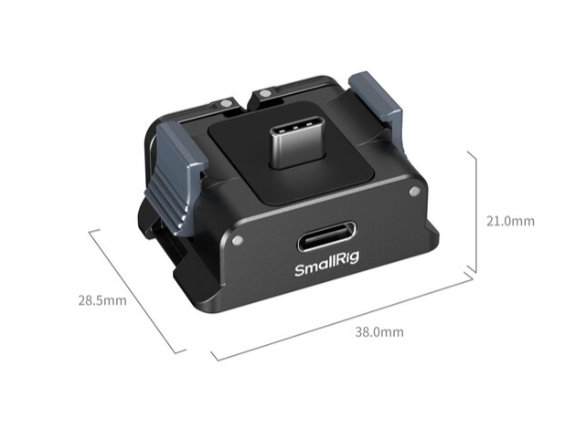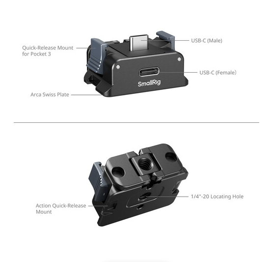 SmallRig baterijska adapter plošča za DJI Osmo Pocket 3 je natančno izdelana montažna rešitev, ki izboljša stabilnost in delovanje vaše kompaktne kamere z gimbalom. Zložljivi adapter z dvema konicama varno pritrdi Osmo Pocket 3 na mesto, medtem ko vgrajena silikonska oblazinjenost ščiti dno kamere in izboljša oprijem med snemanjem iz roke. Vgrajeni moški priključek USB-C prek ženskega vhoda USB-C neposredno prenaša energijo iz zunanjega vira na kamero, kar omogoča neprekinjeno snemanje brez skrbi za baterijo. Osnova vključuje ploščo, ki je popolnoma združljiva z Arca-Swiss, za takojšnjo pritrditev na stativ ali glavo stabilizatorja, ter 1/4"-20 navojno luknjo proti vrtenju za dodatno prilagodljivost pri montaži na kletke, naprave ali sponke. Ta ultralahka plošča iz trpežne črne aluminijeve zlitine tehta le 33 g in meri le 1,5 x 1,1 x 0,8", zato je idealna za filmarje, vlogerje in ustvarjalce akcijskih vsebin, ki potrebujejo hitro, zanesljivo in napajano pritrditev na terenu.