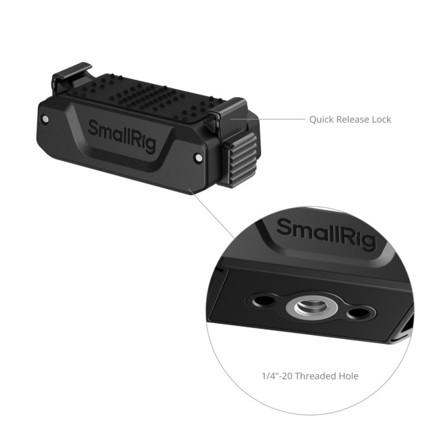 SmallRig dvosmerni adapter za hitro sprostitev z navojno luknjo 1/4"-20 zagotavlja varno, stabilno in hitro namestitev za profesionalne fotografe in videografe. Zasnovan je za akcijske kamere DJI Osmo Nano in Osmo Action 6.