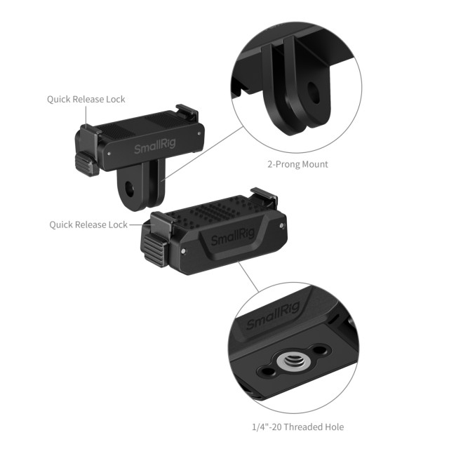 SmallRig dvosmerni adapter za hitro sprostitev z 2-zobnim nosilcem in 1/4"-20 navojno luknjo 5918 ponuja varno, stabilno in hitro sprostitev za profesionalne fotografe in videografe. Inovativen vzmetni mehanizem omogoča takojšnjo namestitev in odstranitev naprave s preprostim stiskom, kar poenostavi delovni tok pri namestitvah z več kamerami.