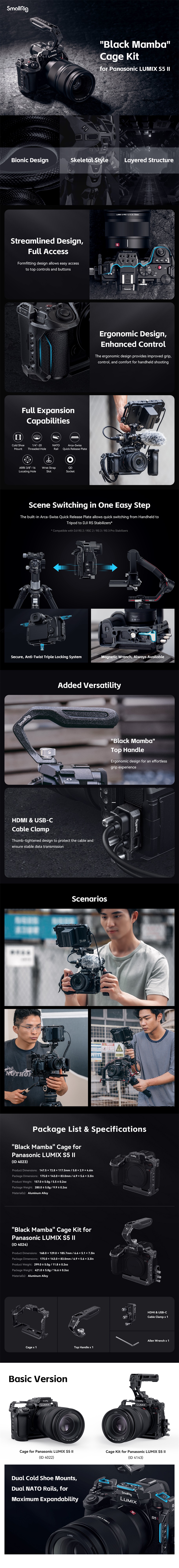 Komplet kletke SmallRig "Black Mamba" za Panasonic LUMIX S5 II / S5 IIX 4024 je zasnovan za pomoč pri fotografiranju iz roke in za pritrditev dodatne opreme. Vključuje kletko, objemko za kable HDMI in USB-C ter zgornji ročaj, ki je ergonomičen; zgornji ročaj je udoben in olajša premikanje fotoaparata ter fotografiranje pod nizkimi koti; poenostavljena kletka s prozornimi robovi omogoča popoln dostop do zgornjih upravljalnih elementov; s kabelsko objemko, ki se zategne s palcem, pa lahko hkrati pritrdite kable HDMI in USB-C.