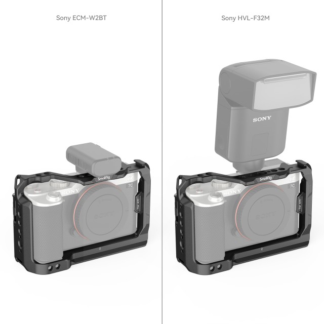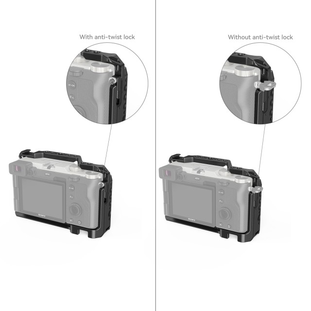 Kletka SmallRig za Sony Alpha 7C 3081B je zasnovana tako, da zagotavlja pritrdilne točke za dodatno opremo, kot so monitorji, mikrofoni in luči LED pri profesionalnem snemanju videoposnetkov. Kletka se na fotoaparat pritrdi z vijakom 1/4"-20 na dnu. Za dodatno preprečevanje zvijanja lahko uporabite tudi zaklep na desni strani, tako da potisnete navzgor drsnik in pritrdite priloženi majhen vijak na luknjo za trak fotoaparata.