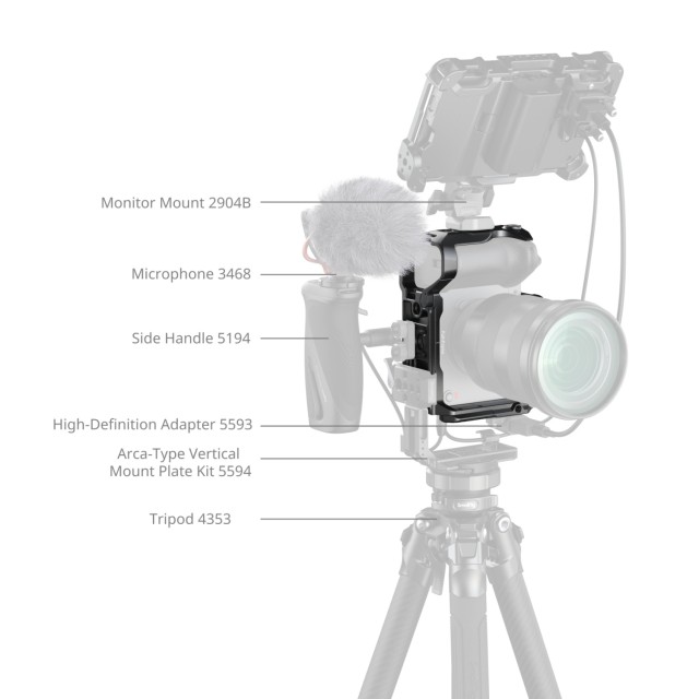 Odstranljiva zgornja plošča ima NATO tirnico, ki omogoča namestitev Sonyjevega XLR ročaja ali SmallRigovega vrtljivega ročaja (ID 4152), ne da bi ovirala EVF. Ohišje ima več pritrdilnih točk, vključno z navojnimi luknjami 1/4"-20, luknjami za pritrditev ARRI 3/8"-16 in NATO-tirnico „HawkLock“ za hitro pritrditev dodatkov, kot so stranski ročaji (ID 4485) in zgornji ročaji (ID 4483). Hladna montažna podlaga omogoča pritrditev naprav, kot sta DJI Mic 2 ali LED-luči, medtem ko QD-vtičnica na dnu omogoča pritrditev ramenskih trakov za lažje prenašanje. Osnova je opremljena tudi z magnetnim imbus ključem, ki omogoča hitro sestavljanje in razstavljanje.