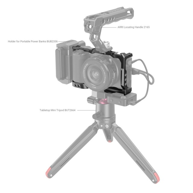 Vključuje skupno več lukenj z navojem 1/4"-20 in lukenj ARRI 3/8"-16, ki omogočajo priključitev zgornjih ročajev HTS2756 in 2771 za snemanje pod nizkim kotom ali priključitev držala BUB2336 za napajalno banko za neprekinjeno napajanje. V vratih za baterijo je puščen izrez za kabel rezervne baterije (navidezna baterija), tako da lahko fotoaparat tudi med uporabo položite ravno na mizo.
