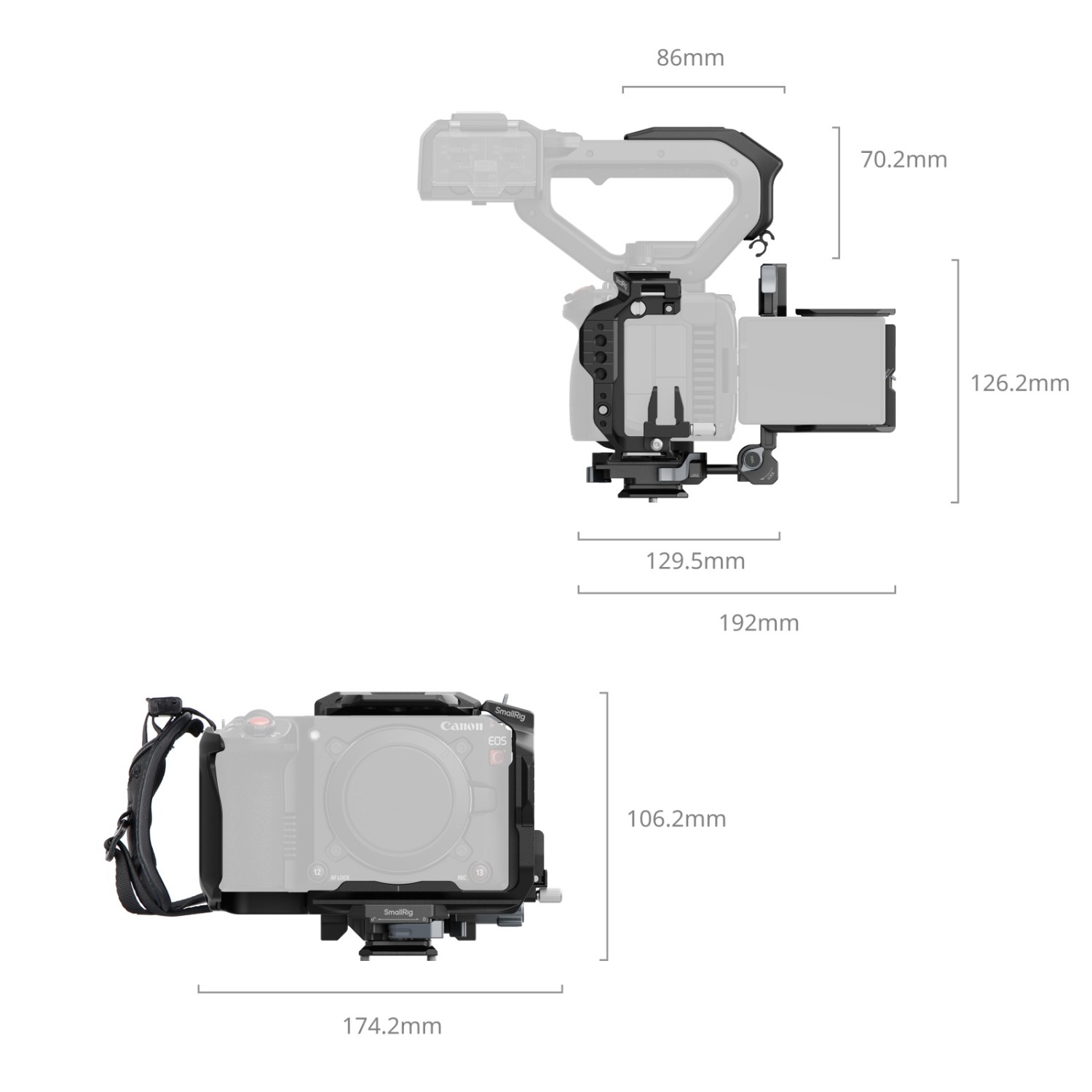 SmallRig Cage Kit za Canon EOS C50 (napredna izdaja) 5658: Celovit aluminijasti okvir z V-mount ploščo za napajanje, podaljškom ročaja XLR, HDMI sponko, NATO tirnico, ročajem, ploščami Arca-Swiss, nosilcem za LCD in vsestranskimi navoji za profesionalno ročno kinematografsko opremo.