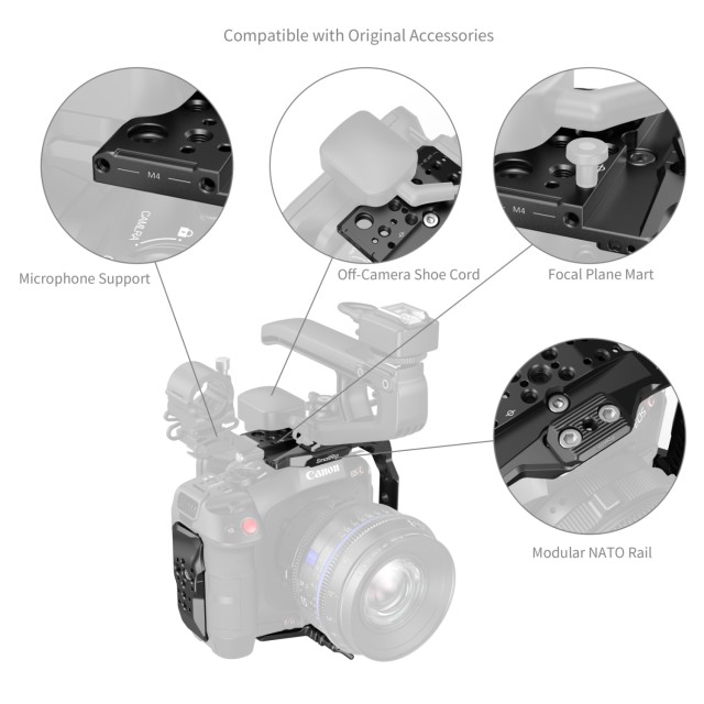 Prilagodite svojo opremo za Canon EOS C80 s kompletom SmallRig Cage Kit 5136 - modularnim sistemom kletk, zasnovanim za največjo prilagodljivost in podporo za dodatno opremo. Njegove plošče je mogoče konfigurirati tako, da ustrezajo nastavitvam stativa in kardana, medtem ko številni navoji 1/4"-20 in ARRI 3/8"-16, tirnice NATO, nastavek za hladno čevelj in vtičnica QD zagotavljajo široke možnosti pritrditve. Priloženi podstavek za hitri sprožilec Arca-Swiss, objemka za kabel HDMI in zgornji ročaj z objemko NATO izboljšajo uporabnost in rokovanje. Nastavljiva opora za adapter za objektiv zagotavlja dodatno stabilnost pri uporabi težjih objektivov, zato je ta kletka robustna rešitev za profesionalno video produkcijo.