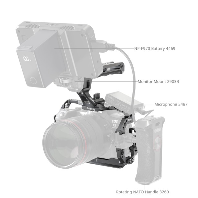 SmallRig Cage Kit za Canon EOS R6 Mark II 5197 je zasnovan tako, da izboljša fotografiranje iz roke ter zagotavlja boljšo prenosljivost in razširitev dodatne opreme. Komplet vključuje kletko, objemko za kabel USB-C in HDMI ter udoben zgornji ročaj za priročno prenašanje fotoaparata in snemanje pod nizkim kotom.