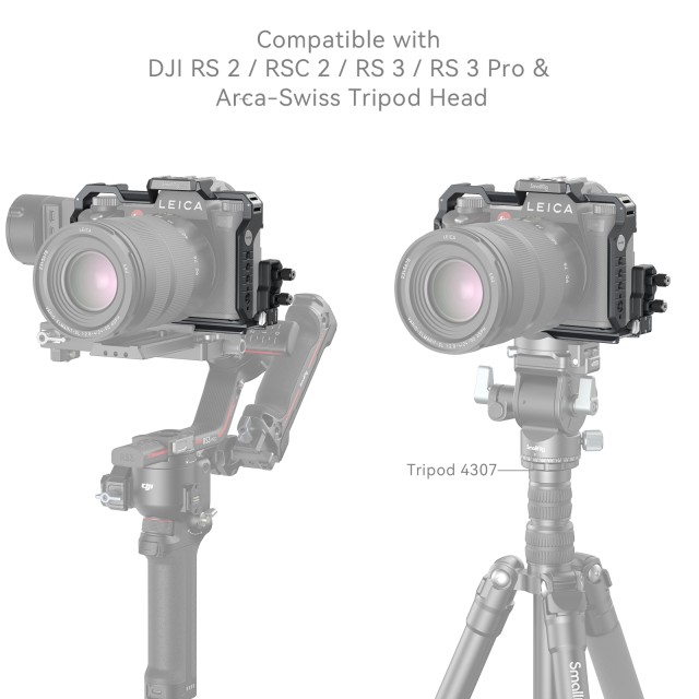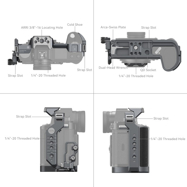 Komplet SmallRig Cage Kit za Leica SL3 4510 je zasnovan za zaščito fotoaparata in razširitev fotoaparata z dodatki, ki vam olajšajo ustvarjalnost. Tritočkovni sistem zaklepanja pritrdi fotoaparat z enim vijakom 1/4"-20 na dnu in dvema stranskima nastavkoma za zaklepanje. Vgrajene silikonske blazinice ščitijo fotoaparat pred praskami. Vsi nosilni deli so izdelani iz titanove zlitine, zato je komplet kletke robusten in vzdržljiv ter omogoča neoviran dostop do vseh vmesnikov fotoaparata. Komplet kletke ima več vmesnikov za namestitev. Na voljo je več možnosti pritrditve, vključno z luknjo z navojem 1/4"-20, namestitveno luknjo ARRI 3/8"-16 in namestitveno luknjo 1/4"-20. Te možnosti lahko uporabite za pritrditev različnih dodatkov, kot so zgornji ročaj(2165C), stranski ročaj(4015 / 4346), čarobna roka(3875) za monitor ali oddajnik slike, baterijska plošča mini V-Mount (2987), objemka za pritrditev prenosnih napajalnikov (2336) za baterijo VB50 mini V-Mount in držalo za monitor (2903B / 2904B), ter držalo hladne čevlje za mikrofon (3487) ali video luči LED(4055). Poleg tega je na voljo reža za trak, ki je združljiva z zapestnim(3848) ali ramenskim(PSC2428) trakom, vtičnica QD, ki podpira hitri ramenski trak QD(4118), in ploščica za hitro sproščanje Arca-Swiss, ki zagotavlja združljivost s stativi tipa Arca in gimbali DJI RS 2 / RSC 2 / RS 3 / RS 3 Pro. Vgrajeni ploščati ključ olajša montažo in demontažo dodatne opreme. Kabelska objemka za sprostitev z enim dotikom zagotavlja hitro in trdno namestitev, ki ščiti kabelski vmesnik in preprečuje nenamerno prekinitev povezave.