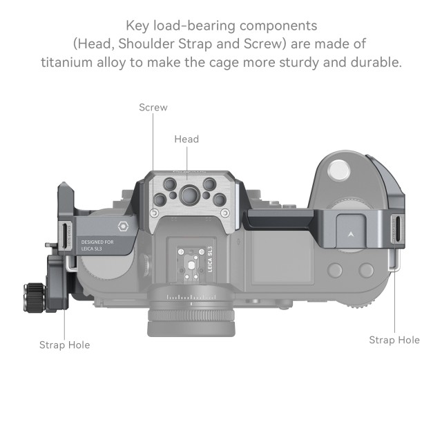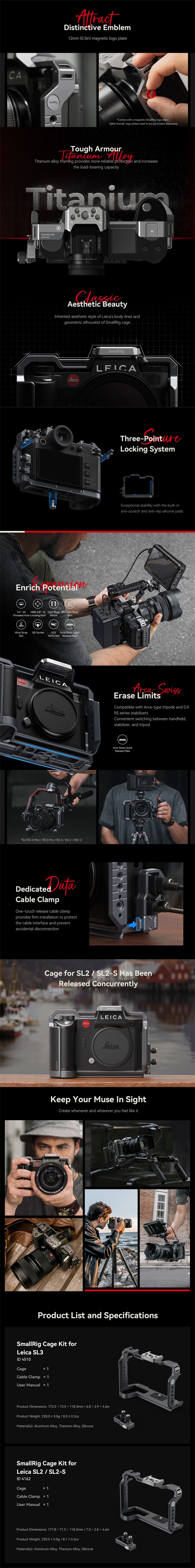 SmallRig Cage Kit za Leica SL3 4510 je zasnovan za zaščito fotoaparata in razširitev fotoaparata z dodatki, ki vam olajšajo ustvarjalnost. Tritočkovni sistem zaklepanja pritrdi fotoaparat z enim vijakom 1/4"-20 na dnu in dvema stranskima nastavkoma za zaklepanje. Vgrajene silikonske blazinice ščitijo fotoaparat pred praskami. Vsi nosilni deli so izdelani iz titanove zlitine, zato je komplet kletke robusten in vzdržljiv ter omogoča neoviran dostop do vseh vmesnikov fotoaparata. Komplet kletke ima več vmesnikov za namestitev.