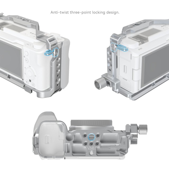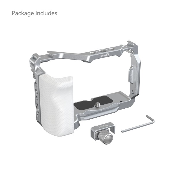 SmallRig Cage Kit za Sony ZV-E1 (omejena izdaja) 4320 je namenjen pritrditvi dodatne opreme ter zaščiti fotoaparata in vrat HDMI. Vključuje kletko s silikonskim ročajem in objemko za kabel HDMI. Kletka pritrdi fotoaparat z enim vijakom 1/4"-20 na dnu in enim adapterjem za stransko zaklepanje na obeh straneh, ergonomski silikonski ročaj pa omogoča udoben oprijem. Sponka za kabel HDMI se pritrdi na levo stran kamere ZV-E1 s pomočjo vijaka 1/4"-20 in dveh zatičev proti zvijanju, da zaščiti vrata HDMI in zagotovi stabilen prenos.