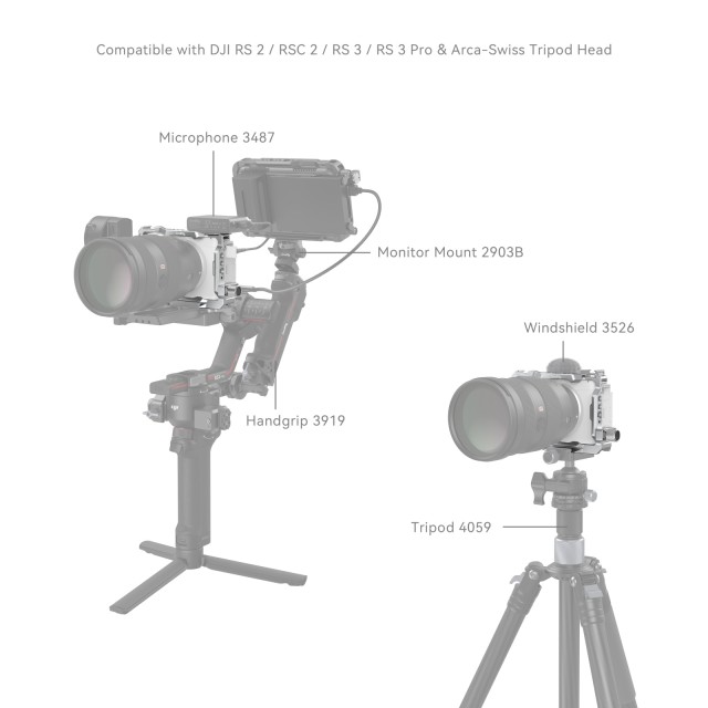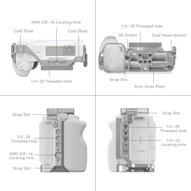 Na voljo je več pritrdilnih točk za dodatno opremo, vključno z luknjami z navojem 1/4"-20 in luknjami ARRI 3/8"-16 za zgornji ročaj 3765, stranski ročaj 2913, eno zgornjo luknjo ARRI 3/8"-16 za montažo monitorja 2903B, dvema hladnima nastavkoma za mikrofon in video luč LED ter spodnjo vtičnico QD za ramenski trak. Ploščica za hitro sproščanje Arca-Swiss na dnu podpira stabilizatorje DJI RS 2 / RSC 2 / RS 3 / RS 3 Pro, ploščico za hitro sproščanje stabilizatorja DJI RS 2 / RSC 2 (blazinica za povečanje višine) in ploščico za hitro sproščanje Arca-Type 3154. Ta izdelek ima na obeh straneh in na dnu tudi odprtine za trakove, ki so združljivi z ročnim trakom PAC2456, ramenskim trakom PSC2428 itd. Poleg tega je priložen magnetni ključ za enostavno razstavljanje in sestavljanje.
