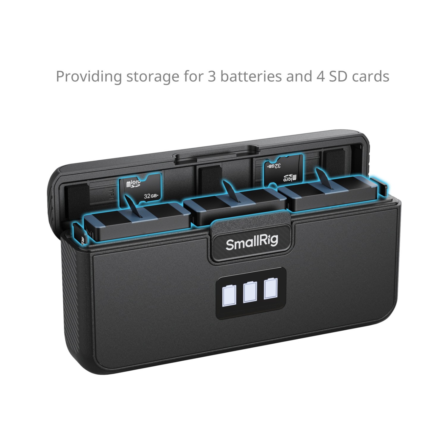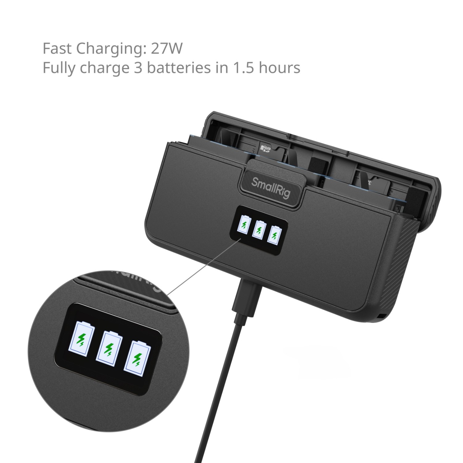 SmallRig polnilnik baterij za kamere GoPro 9/10/11/12 5418 ima robustno PD 27W ultra hitro polnjenje, ki omogoča hkratno polnjenje treh baterij, kar zagotavlja učinkovite in zmogljive možnosti polnjenja.