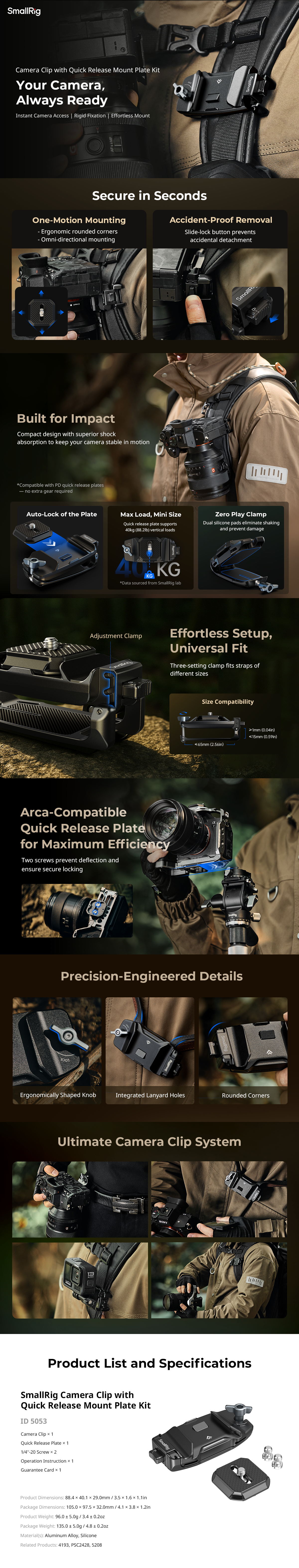 Pripomoček SmallRig Camera Clip with Quick Release Mount Plate Kit 5053 je posebej zasnovan za fotografe, ki so vedno v gibanju. Komplet vključuje sponko za fotoaparat, ploščico za hitro sprostitev in vijak 1/4''-20 ter uporabniku prijazno zasnovo: ploščico za hitro sprostitev lahko vstavite v katero koli smer, pri čemer se samodejno zaklene na mestu. Podpira tudi sproščanje z enim delovanjem, kar zagotavlja zelo učinkovito montažo in demontažo.