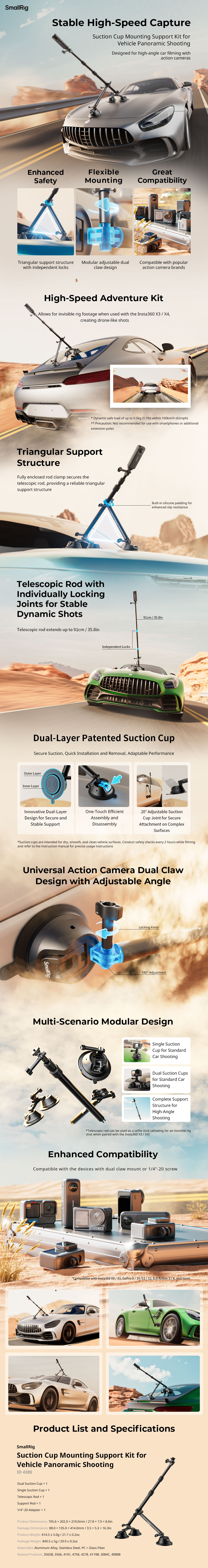 SmallRig Camera Suction Cup Car Mount Kit for Panoramic Shooting 4380 je zasnovan posebej za panoramsko fotografiranje s fotoaparatom v avtomobilu, saj omogoča učinke fotografiranja z nizke višine, podobne dronu. Ta komplet za namestitev je zasnovan modularno in vključuje dvojno sesalno čašo, enojno sesalno čašo, teleskopsko palico, podporno palico in adapter 1/4"-20. Ta komplet za namestitev, izdelan iz trpežne aluminijeve zlitine, zagotavlja stabilnost in dolgo življenjsko dobo ter podpira do 0,5 kg / 1,1 lb, kar omogoča namestitev večine akcijskih kamer na trgu. Zasnova priseskov z enim dotikom omogoča hitro montažo in demontažo, patentirana dvoslojna zasnova priseskov pa zagotavlja varno in stabilno podporo za vaše potrebe snemanja. Z nastavljivim razponom 20° na priključnih spojih priseskov lahko nosilec enostavno pritrdite na ukrivljene površine za vsestranske kote snemanja.