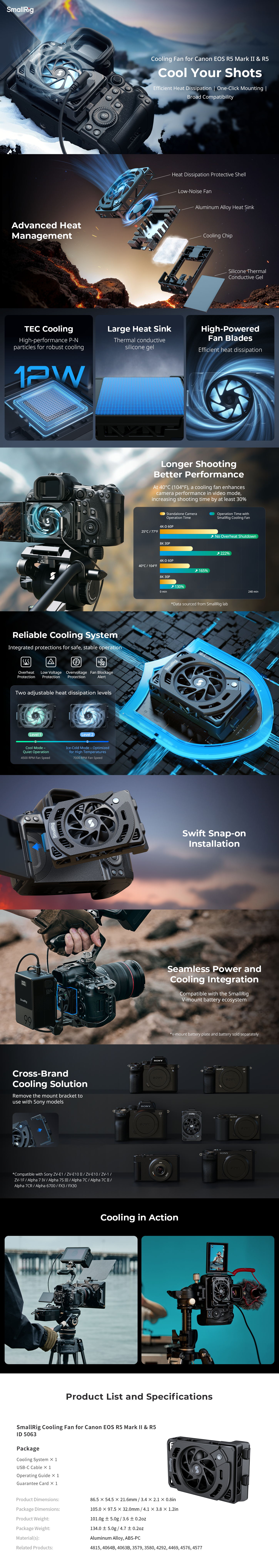 Hladilni ventilator SmallRig za Canon EOS R5 Mark II in R5 5063 je zasnovan za reševanje težav s pregrevanjem Canonovih brezzrcalnih fotoaparatov, kar omogoča daljše snemanje visokokakovostnih videoposnetkov. Njegov napredni hladilni sistem, ki združuje ventilator s 7000 vrtljaji na minuto in tehnologijo hlajenja TEC, zagotavlja optimalno odvajanje toplote in preprečuje pregrevanje fotoaparata. Ventilator z dvojno hitrostjo ima načine visoke in nizke hitrosti, ki so prilagojeni različnim scenarijem snemanja. Njegova zasunljiva zasnova brez orodja omogoča hitro namestitev in odstranitev ter enostaven dostop do ventilatorja in zaslona LCD fotoaparata. Poleg tega mu je priložen nosilec za pritrditev na fotoaparate Canon, Sony in druge brezzrcalne fotoaparate. Ventilator je združljiv tudi s kompleti ploščic za namestitev baterije V-mount (ID 4064B, 4063B) in baterijami V-mount (ID 3579, 4608, 4292) za učinkovito hlajenje in napajanje.
