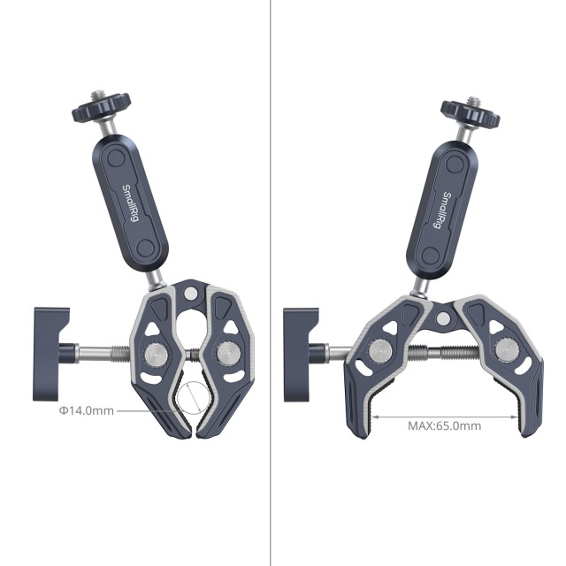 Sponka podpira palice od Φ14 mm do Φ60 mm in površine debeline do 65 mm (2,5 in), kar omogoča hitro pritrditev kamer, monitorjev, video luči LED in drugega na palice, mize, noge stativov in obroče ročnih stabilizatorjev. Vgrajene blazinice povečujejo zaščito in stabilnost vpenjanja.