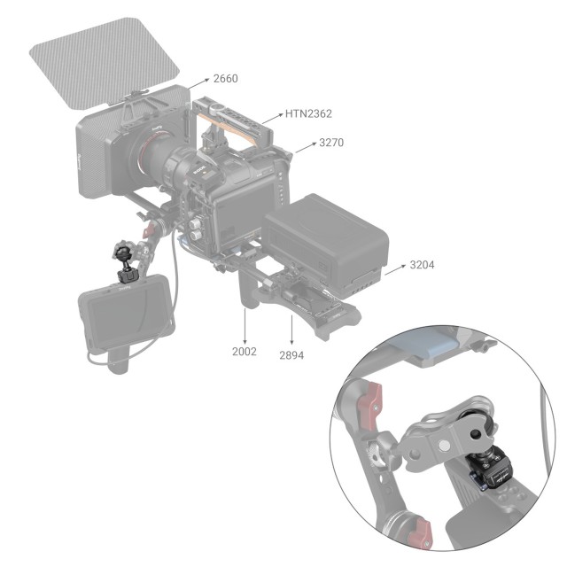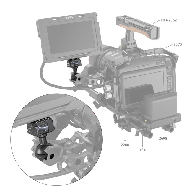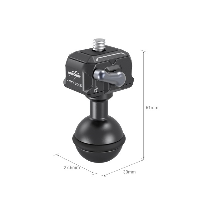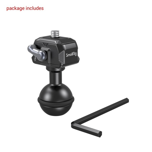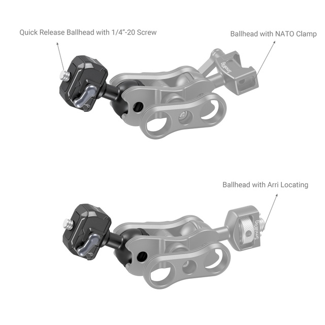 SmallRig 1/4"-20 3600 krogelna glava s hitrim sproščanjem, en konec se pritrdi na krogelno glavo, drugi konec plošče za hitro sproščanje pa se prilega napravam z navojem 1/4"-20, kot so fotoaparati, monitorji, kletke, montažne plošče. Na osnovno ploščo jo je mogoče navpično in stabilno pritrditi brez odklona. Zaklenete in odklenete jo lahko s klikom, zato je upravljanje enostavno. Gumijaste blazinice na krogelni glavi povečajo trenje med glavo in objemko ter zagotavljajo varno zaklepanje. Ta kroglična glava je zamenljiva tudi z glavo na obeh koncih roke Magic Arm 2070/2071/2072.