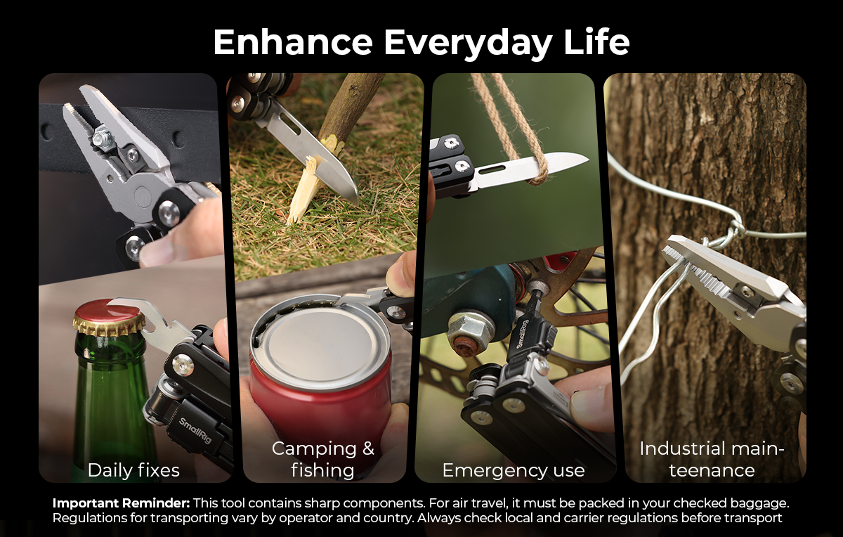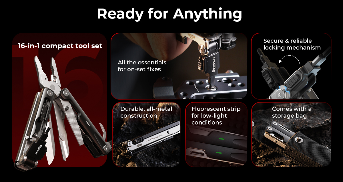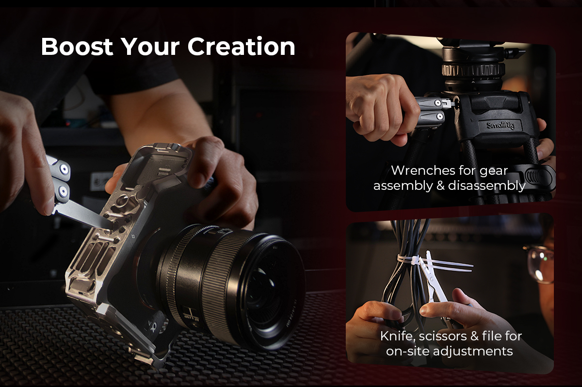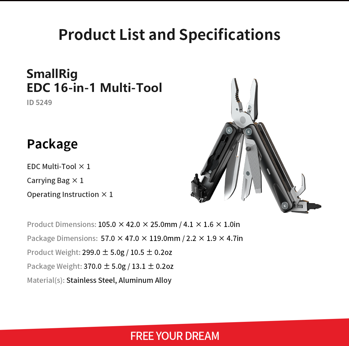 SmallRig EDC Multi-Tool 5294 je vsestranska rešitev, prilagojena ustvarjalcem in filmskim ustvarjalcem. V enem samem kompletu združuje 16 osnovnih orodij, vključno z imbus ključi (H2, H2.5, H3, H4), ravnim ključem, nožem, škarjami, pilico in kleščami – nepogrešljivimi pri prilagajanju opreme na poti. Komplet vključuje tudi vsakdanja orodja, kot so izvijač SL5 z ravno glavo in izvijač PH1 Phillips, odpirač za steklenice in pločevinke ter ravnilo z dvojno lestvico (metrično in imperialno). Integrirana zložljiva zasnova združuje celoten komplet orodja v komplet velikosti žepa, kar zagotavlja največjo učinkovitost na terenu.